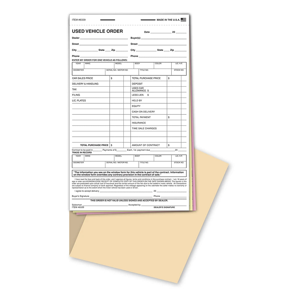 These handy books can be used either as a preliminary worksheet or as a final sales agreement, making them a must-have tool for used car sales. Their compact design and snap-out format streamline the sales process and ensure clear records for both the dealership and the customer.