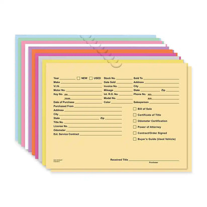 Our Standard Deal Jackets provide an efficient and organized way to store important vehicle paperwork. Compatible with DSA-546 and DSA-500, these jackets are designed for seamless integration into your dealership’s existing system. Available in 12 different colors, they make it easy to categorize inventory by car type, model year, or any system that works best for you. Made from durable 32# Kraft paper, these jackets ensure long-lasting use while keeping documents secure. Order in packs of 500 and Save Big!