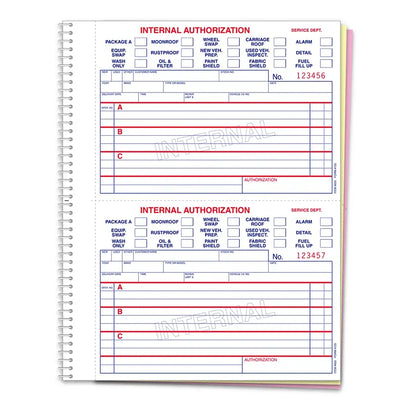 This book provides a permanent written record of who authorized work to be done or equipment to be added, or removed from a vehicle. With a perforated design for easy separation, the third part remains in the book for secure record-keeping.