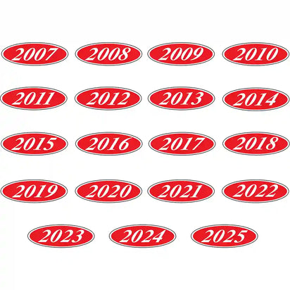 Enhance lot sales with Model Year Red & White Windshield Oval Stickers. Ideal for Cars and Trucks, these stickers effectively guide customers to their desired model year while also preserving windshield clarity for test drives.  Sold by the dozen