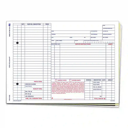 Keep your service department organized and running efficiently with our 3-Part Snap-Out Repair Orders. Designed for seamless record-keeping, these forms feature carbon interleaved copies for easy documentation and tracking. Printed in vibrant red and blue ink, they offer a professional appearance while ensuring all necessary information is clearly visible. Compatible with a variety of dealership systems, these forms make service documentation quick and hassle-free.