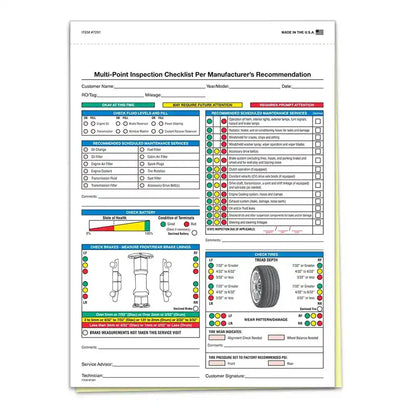 Boost customer satisfaction and increase service revenue with our Multipoint Inspection Forms. These easy-to-use forms help technicians document vehicle conditions, highlight recommended services, and build customer trust through transparent reporting. The 2-part carbonless snap-out design ensures that both the service team and customers get clear, professional copies. With a full-color first sheet for visual impact and a black ink second copy for records, these forms make it simple to communicate necessary repairs and maintenance.